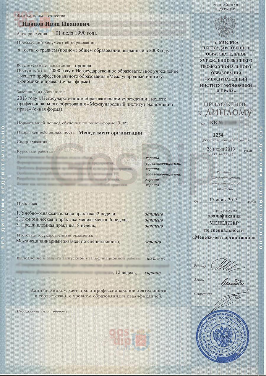 В верхней части правой стороны бланка диплома указывается город или населенный пункт, где находится вуз, и официальное название вуза (как в уставе) в именительном падеже. (Здесь: г. Москва, Междунарондный институт экономики и права)